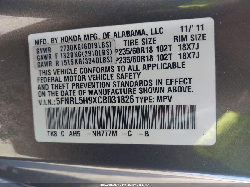Цвет СерыйЦилиндры 6Привод Передний приводVIN 5FNRL5H9XCB031826Состояние СтационарноПовреждения Передняя или задняя