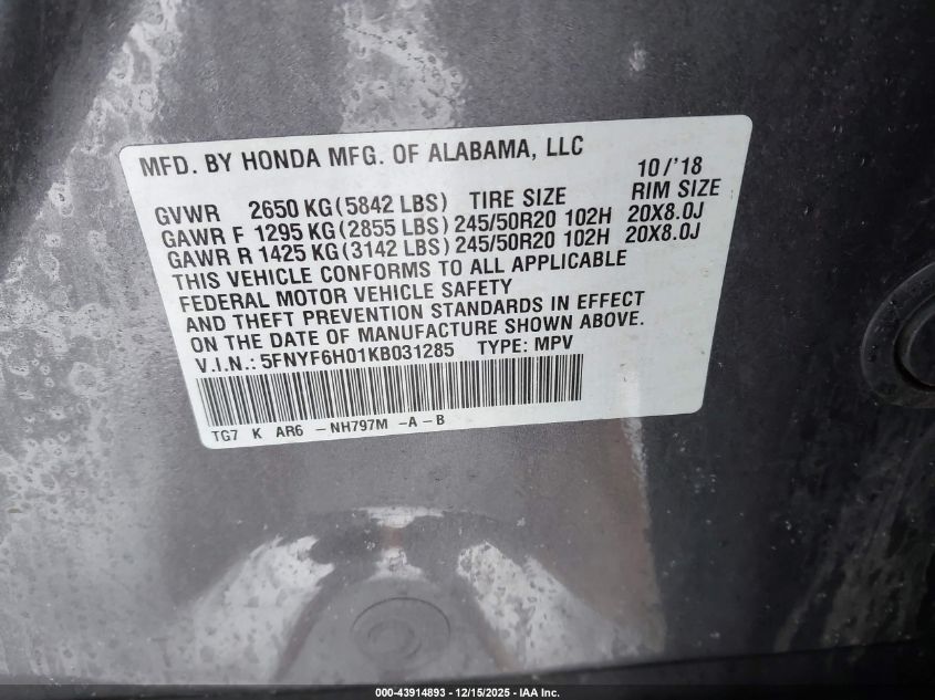 2019 HONDA PILOT - 5FNYF6H01KB031285, цвет - Серый, 3.5, Бензин, Полный привод из США