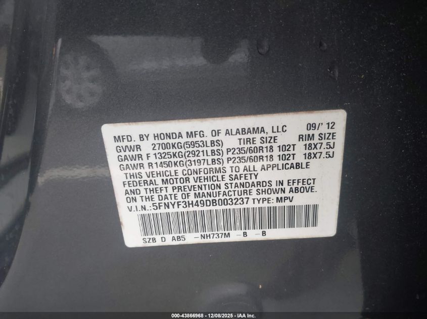 Цвет СерыйЦилиндры 6Привод Передний приводVIN 5FNYF3H49DB003237Состояние Заводится и едет (проверено)Повреждения Передняя или задняя