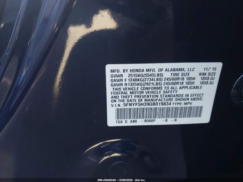 2016 HONDA PILOT - 5FNYF5H39GB019834, цвет - Синий, 3.5, Бензин, Передний привод из США