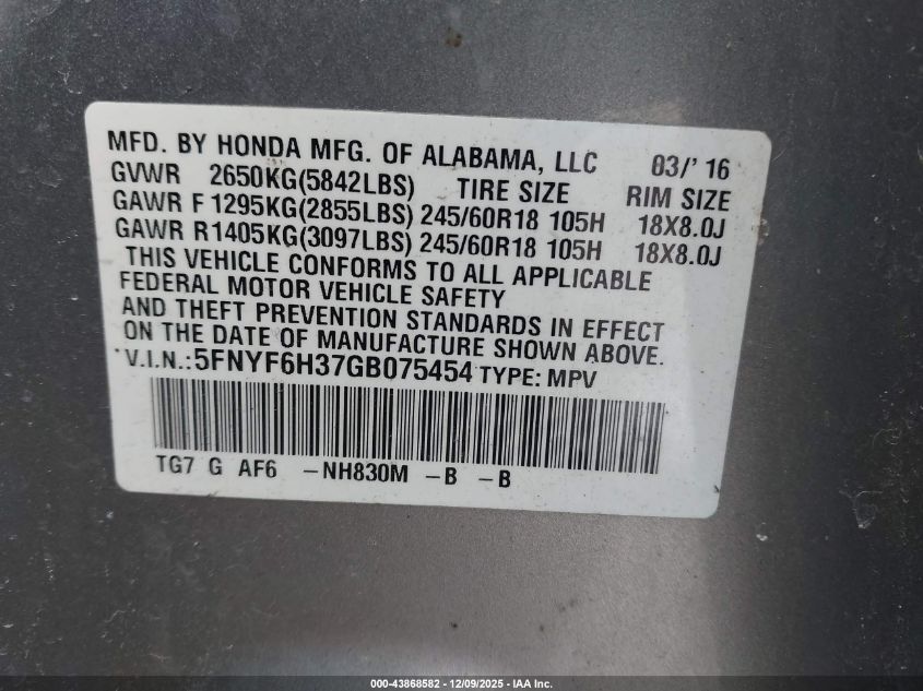 2016 HONDA PILOT - 5FNYF6H37GB075454, цвет - Серебряный, 3.5, Бензин, Полный привод из США