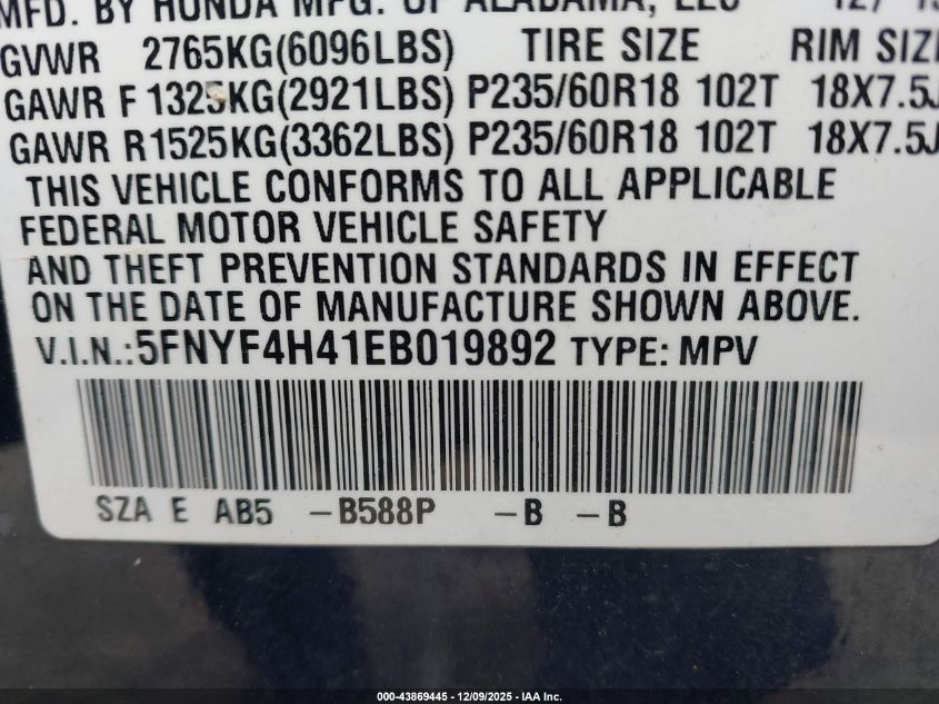 Цвет СинийЦилиндры 6Привод Полный приводVIN 5FNYF4H41EB019892Состояние СтационарноПовреждения Передняя или задняя