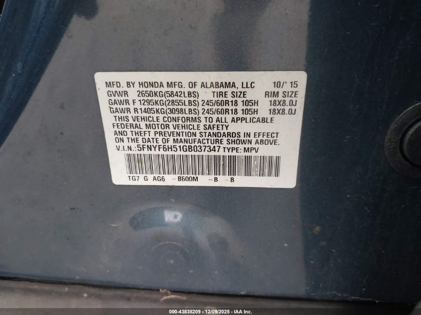 2016 HONDA PILOT - 5FNYF6H51GB037347, цвет - Синий, 3.5, Бензин, Полный привод из США