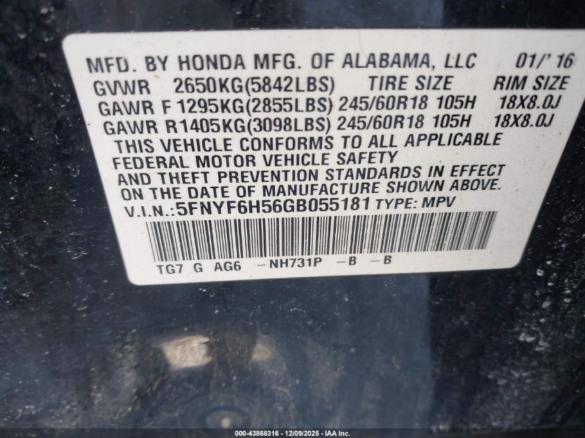 2016 HONDA PILOT - 5FNYF6H56GB055181, цвет - Черный, 3.5, Бензин, Полный привод из США