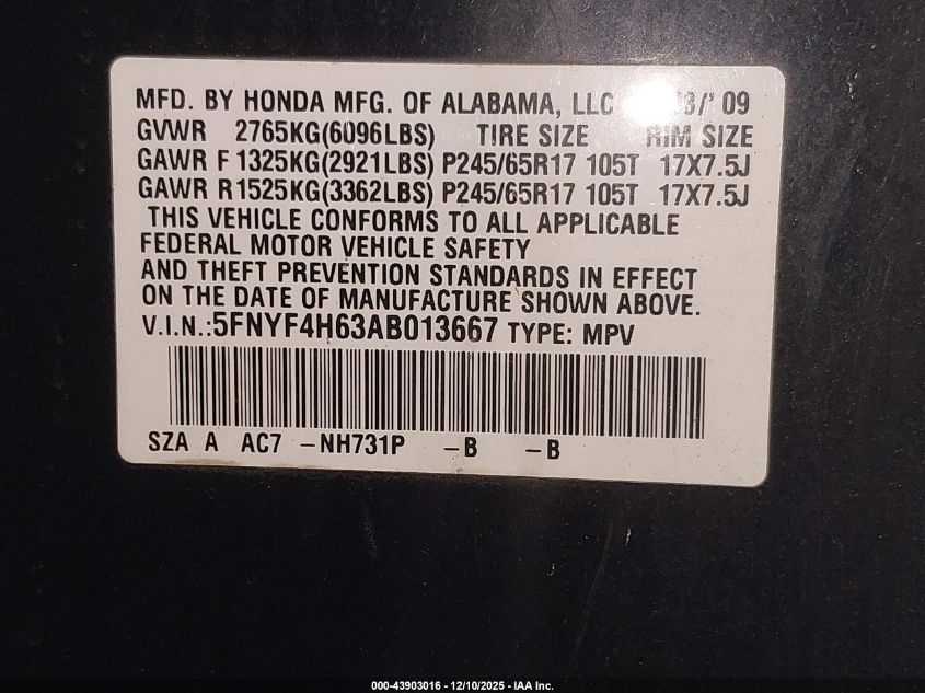 Цвет ЧерныйЦилиндры 6Привод Полный приводVIN 5FNYF4H63AB013667Состояние ЗаводитсяПовреждения Левая сторона
