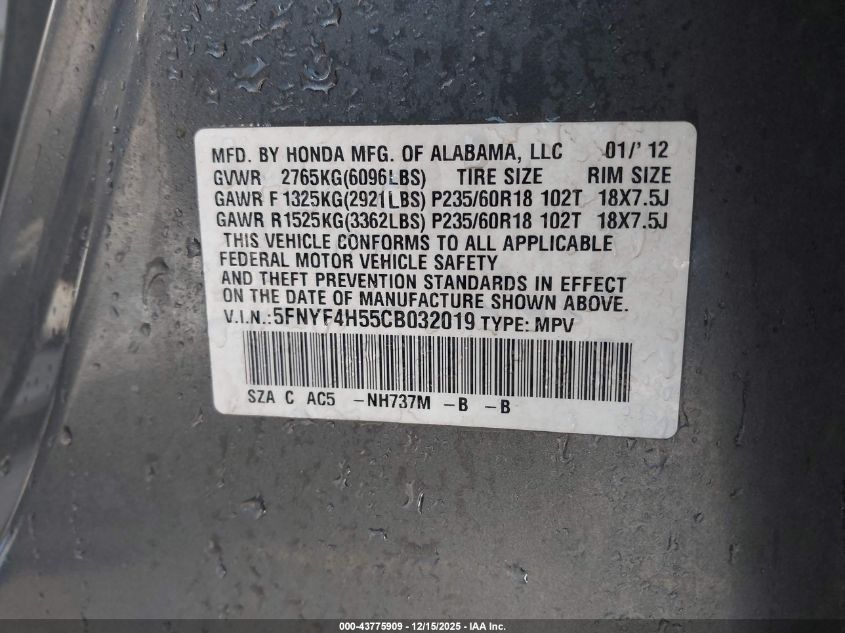 Цвет СерыйЦилиндры 6Привод Полный приводVIN 5FNYF4H55CB032019Состояние Заводится и едет (проверено)Повреждения Правая сторона