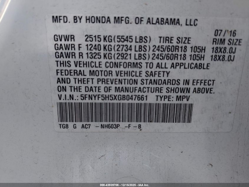 2016 HONDA PILOT - 5FNYF5H5XGB047661, цвет - Белый, 3.5, Бензин, Передний привод из США