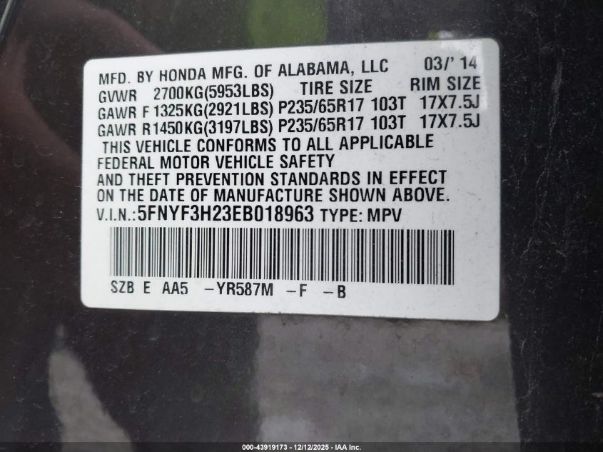 Цвет СерыйЦилиндры 6Привод Передний приводVIN 5FNYF3H23EB018963Состояние Заводится и едет (проверено)Повреждения Правая сторона