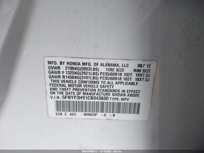 Цвет БелыйЦилиндры 6Привод Передний приводVIN 5FNYF3H91CB043600Состояние Заводится и едет (проверено)Повреждения Правая сторона