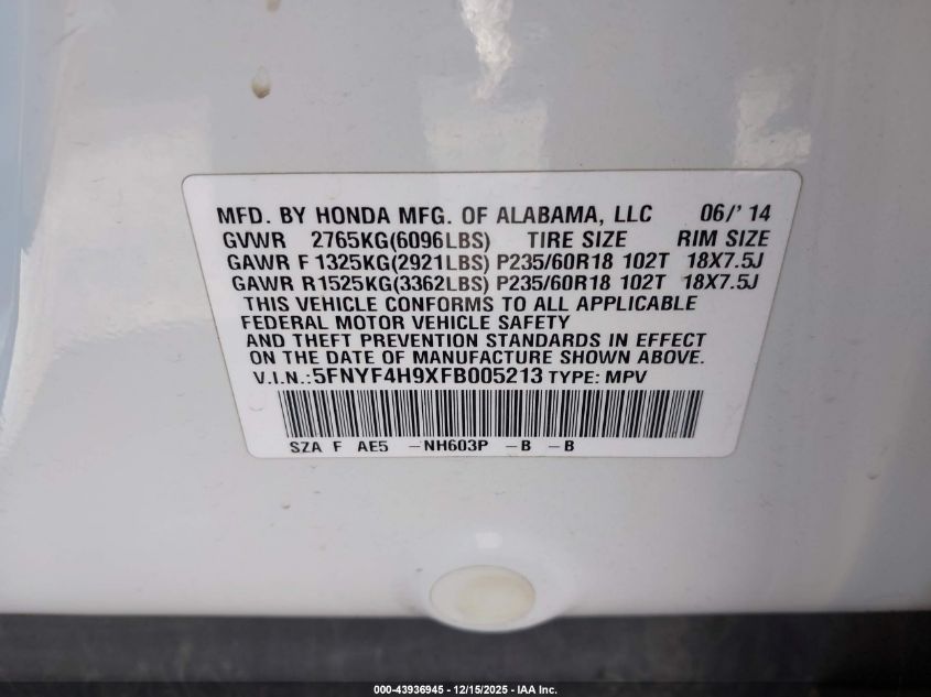 2015 HONDA PILOT - 5FNYF4H9XFB005213, цвет - Белый, 3.5, Бензин, Полный привод из США