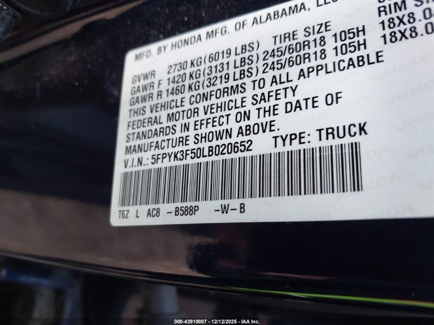 Цвет СинийЦилиндры 6Привод Полный приводVIN 5FPYK3F50LB020652Состояние Заводится и едет (проверено)Повреждения Правая сторона