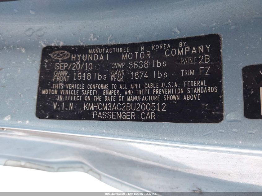 Цвет СинийЦилиндры 4Привод Передний приводVIN KMHCM3AC2BU200512Состояние Заводится и едет (проверено)Повреждения Передняя или задняя