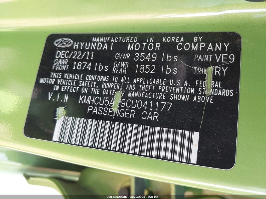 2012 HYUNDAI ACCENT - KMHCU5AE9CU041177, цвет - Зеленый, 1.6, Бензин, Передний привод из США