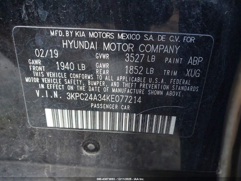 2019 HYUNDAI ACCENT - 3KPC24A34KE077214, цвет - Черный, 1.6, Бензин, Передний привод из США