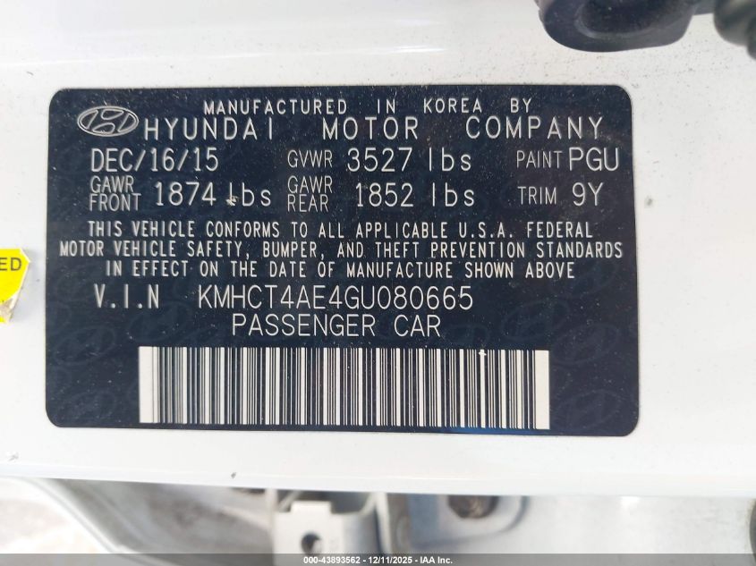 2016 HYUNDAI ACCENT - KMHCT4AE4GU080665, цвет - Белый, 1.6, Бензин, Передний привод из США
