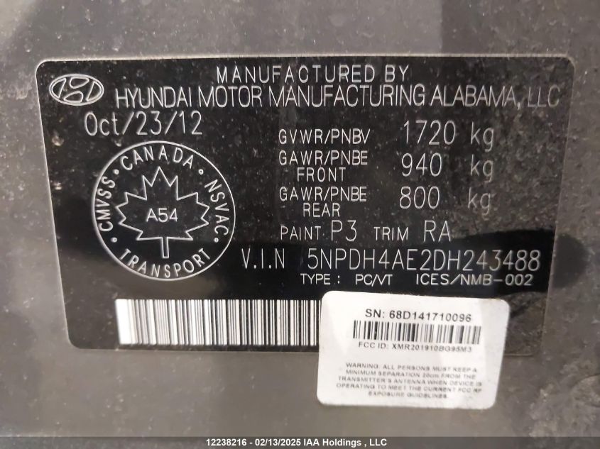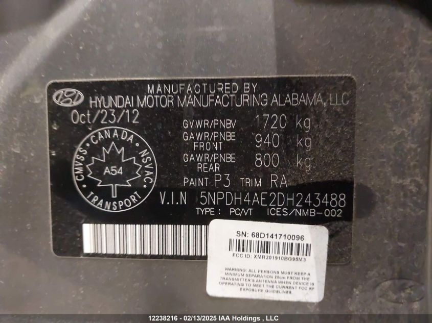 Цвет СерыйЦилиндры 4Привод Передний приводVIN 5NPDH4AE2DH243488Состояние СтационарноПовреждения ПередняяДата аукциона 2025-12-18