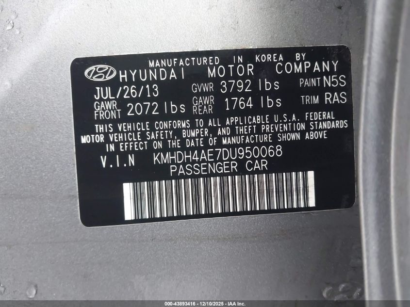 2013 HYUNDAI ELANTRA - KMHDH4AE7DU950068, цвет - Серый, 1.8, Бензин, Передний привод из США