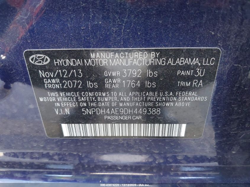 2013 HYUNDAI ELANTRA - 5NPDH4AE9DH449388, цвет - Синий, 1.8, Бензин, Передний привод из США
