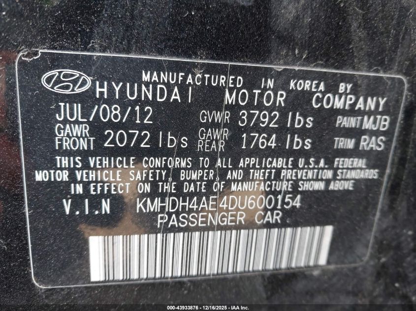 Цвет ЧерныйЦилиндры 4Привод Передний приводVIN KMHDH4AE4DU600154Состояние СтационарноПовреждения Передняя или задняяДата аукциона 2025-12-18