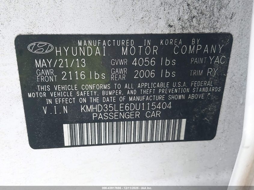 2013 HYUNDAI ELANTRA - KMHD35LE6DU115404, цвет - Белый, 1.8, Бензин, Передний привод из США