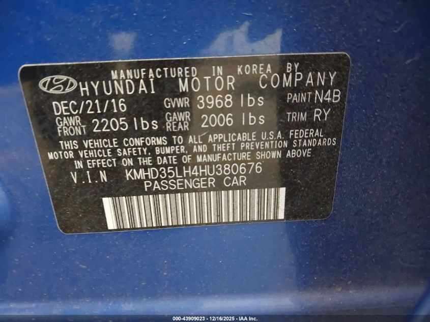 2017 HYUNDAI ELANTRA - KMHD35LH4HU380676, цвет - , 2.0, Бензин, Передний привод из США