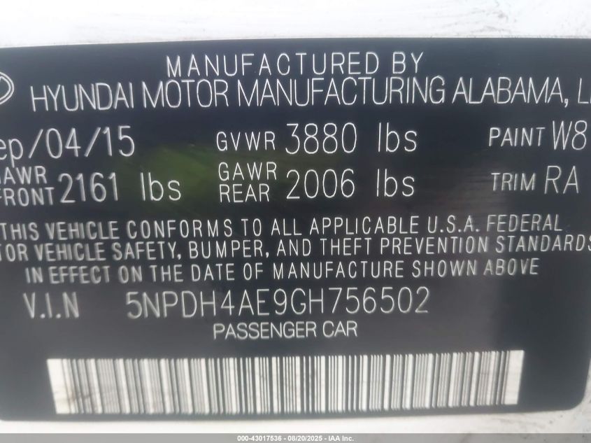 2016 HYUNDAI ELANTRA - 5NPDH4AE9GH756502, цвет - Белый, 1.8, Бензин, Передний привод из США