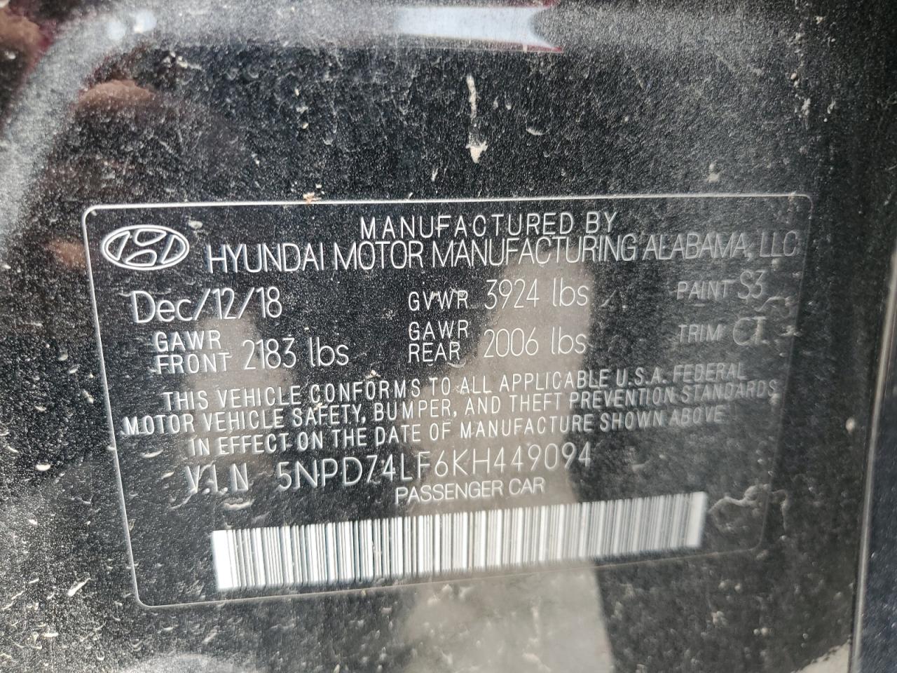 2019 HYUNDAI ELANTRA - 5NPD74LF6KH449094, цвет - Черный, 2.0, Бензин, из США