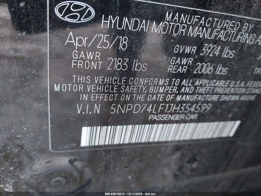 2018 HYUNDAI ELANTRA - 5NPD74LF1JH354599, цвет - Черный, 2.0, Бензин, Передний привод из США