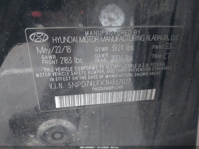 2018 HYUNDAI ELANTRA - 5NPD74LFXJH367027, цвет - Черный, 2.0, Бензин, Передний привод из США