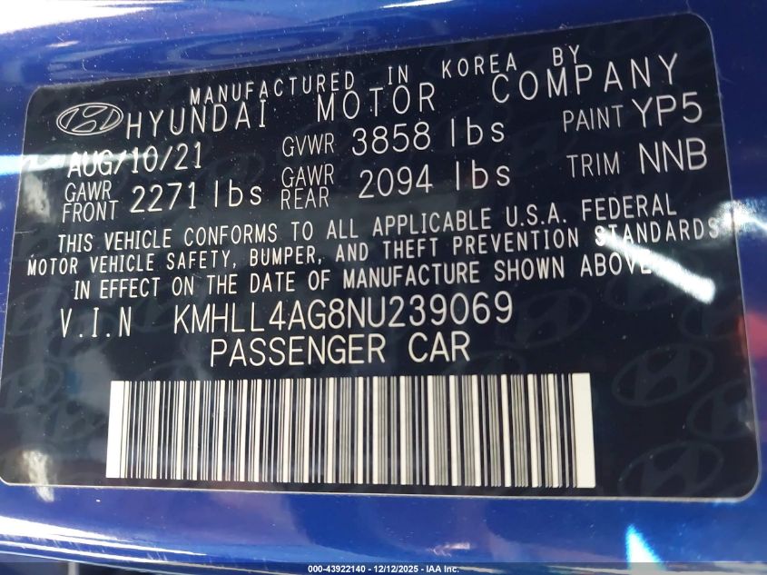 2022 HYUNDAI ELANTRA - KMHLL4AG8NU239069, цвет - Синий, 2.0, Бензин, Передний привод из США