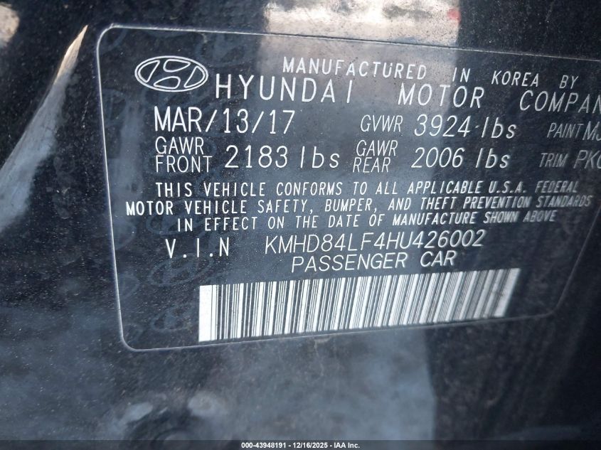 2017 HYUNDAI ELANTRA - KMHD84LF4HU426002, цвет - , 2.0, Бензин, Передний привод из США