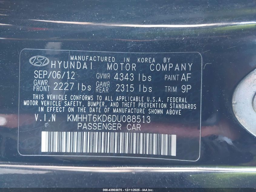 2013 HYUNDAI GENESIS - KMHHT6KD6DU088513, цвет - Черный, 2.0, Бензин, Задний привод из США