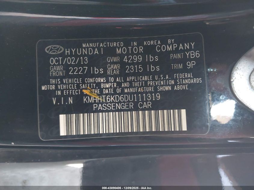 2013 HYUNDAI GENESIS - KMHHT6KD6DU111319, цвет - Черный, 2.0, Бензин, Задний привод из США
