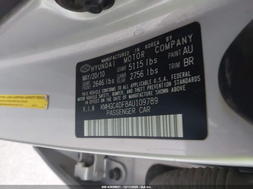 2010 HYUNDAI GENESIS - KMHGC4DF8AU109789, цвет - Серебряный, 4.6, Бензин, Задний привод из США