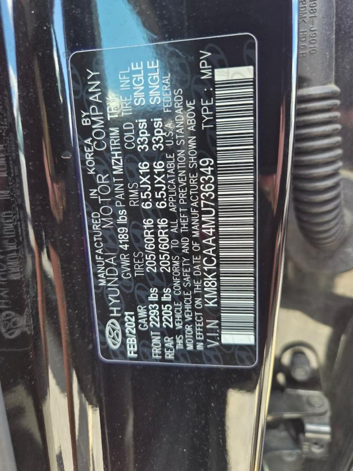 2021 HYUNDAI KONA - KM8K1CAA4MU736349, цвет - Черный, 2.0, Бензин, Полный привод из США