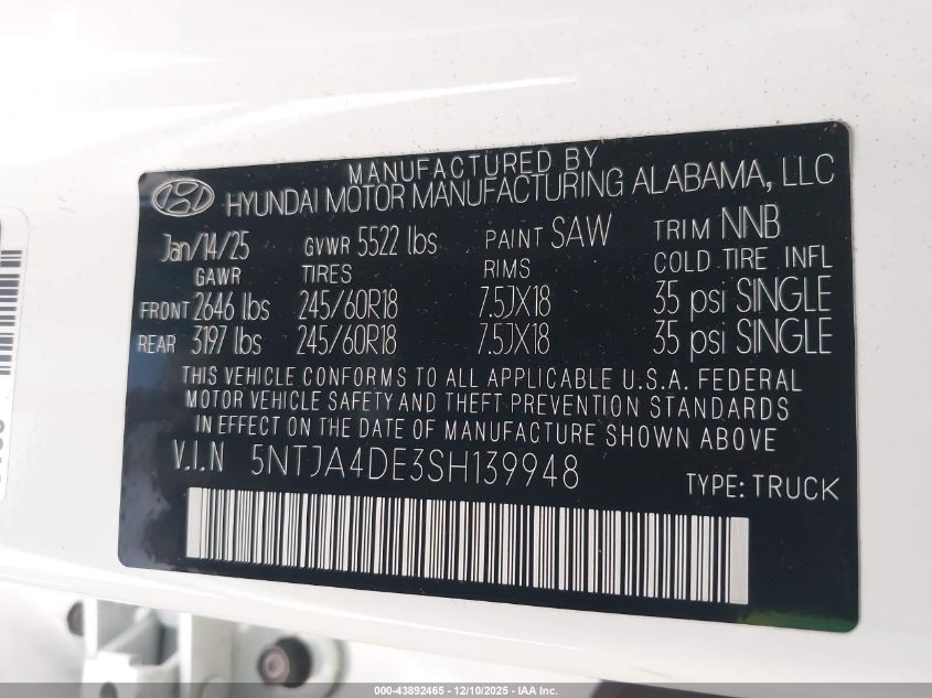 2025 HYUNDAI SANTA CRUZ - 5NTJA4DE3SH139948, цвет - Белый, 2.5, Бензин, Передний привод из США