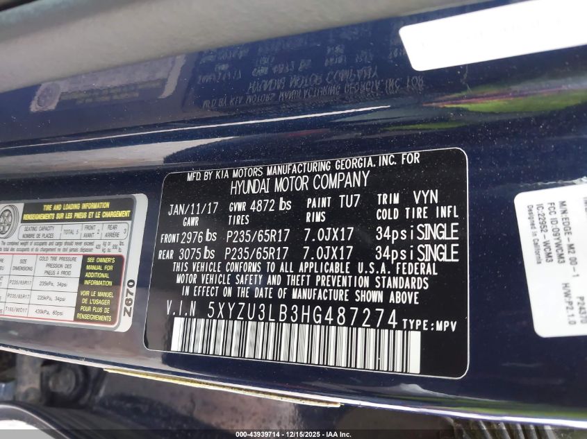 2017 HYUNDAI SANTA FE - 5XYZU3LB3HG487274, цвет - , 2.4, Бензин, Передний привод из США