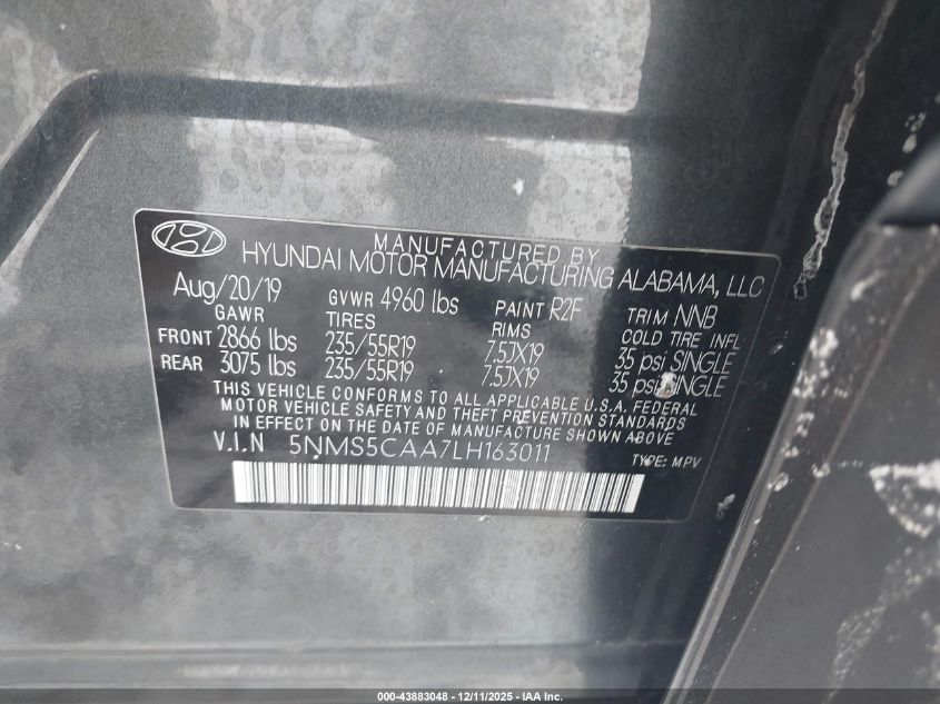 2020 HYUNDAI SANTA FE - 5NMS5CAA7LH163011, цвет - Черный, 2.0, Бензин, Полный привод из США