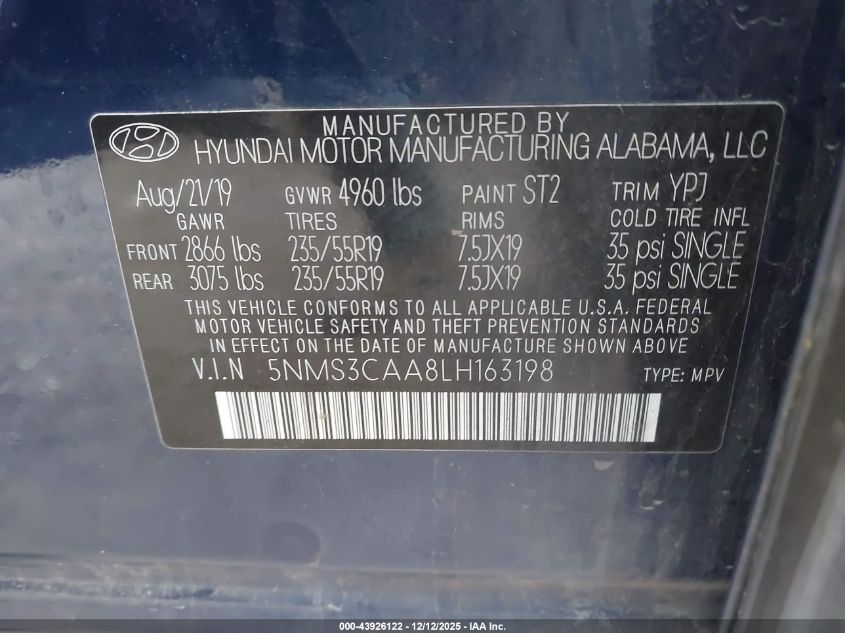 2020 HYUNDAI SANTA FE - 5NMS3CAA8LH163198, цвет - Синий, 2.0, Бензин, Полный привод из США