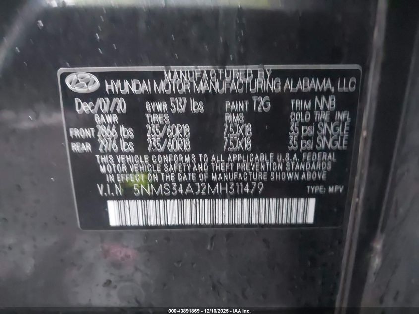 2021 HYUNDAI SANTA FE - 5NMS34AJ2MH311479, цвет - Серый, 2.5, Бензин, Передний привод из США
