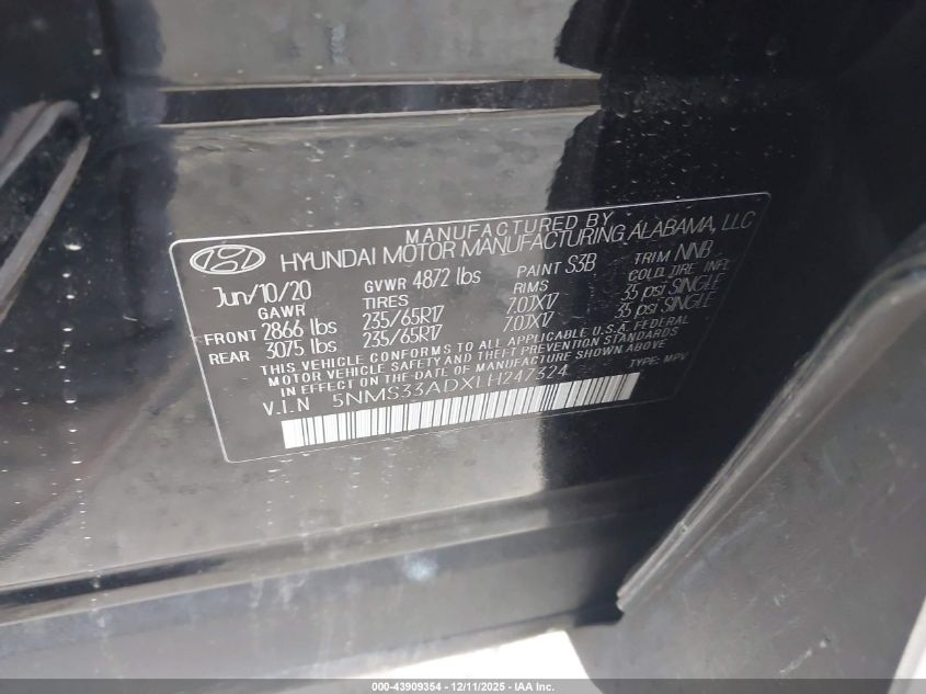 2020 HYUNDAI SANTA FE - 5NMS33ADXLH247324, цвет - Черный, 2.4, Бензин, Передний привод из США