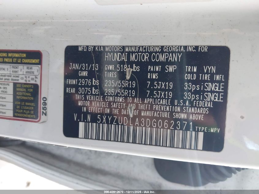 Цвет БелыйЦилиндры 4Привод Полный приводVIN 5XYZUDLA3DG062371Состояние СтационарноПовреждения По всему авто