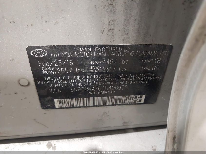 2016 HYUNDAI SONATA - 5NPE24AF0GH400955, цвет - Серебряный, 2.4, Бензин, Передний привод из США