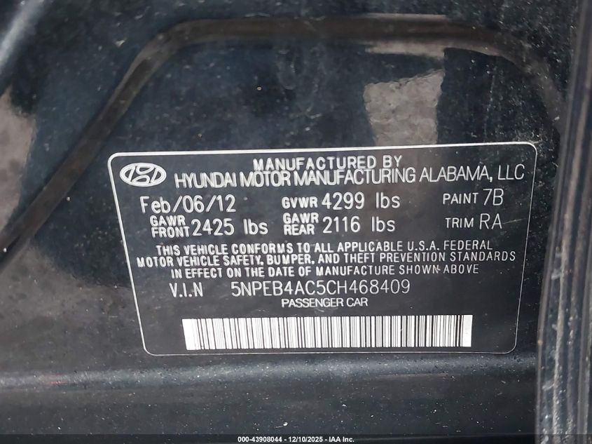 2012 HYUNDAI SONATA - 5NPEB4AC5CH468409, цвет - Черный, 2.4, Бензин, Передний привод из США