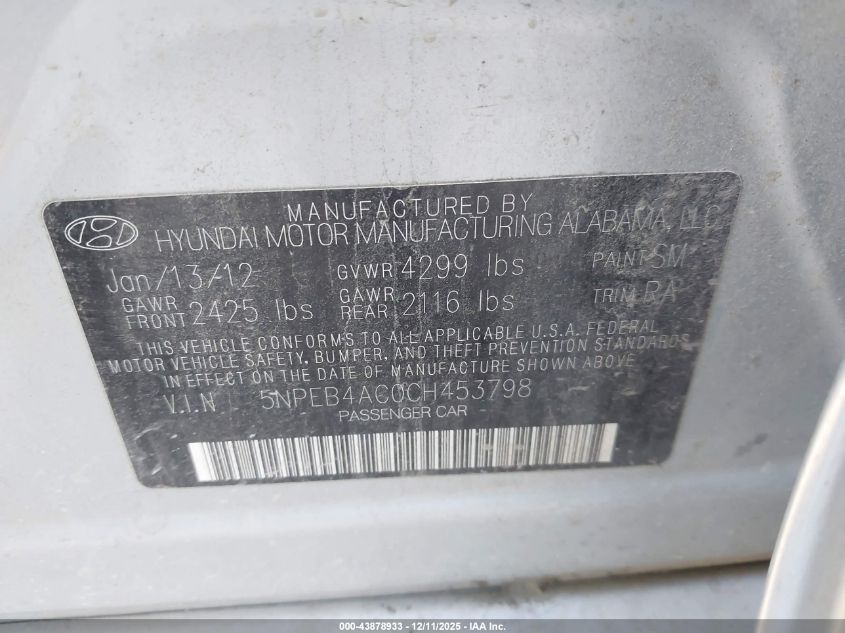 2012 HYUNDAI SONATA - 5NPEB4AC0CH453798, цвет - Серебряный, 2.4, Бензин, Передний привод из США