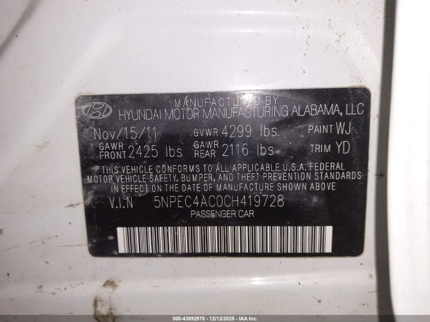 2012 HYUNDAI SONATA - 5NPEC4AC0CH419728, цвет - Белый, 2.4, Бензин, Передний привод из США