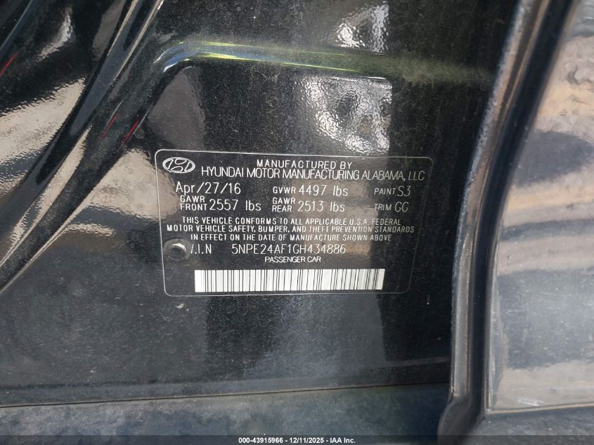 2016 HYUNDAI SONATA - 5NPE24AF1GH434886, цвет - Черный, 2.4, Бензин, Передний привод из США