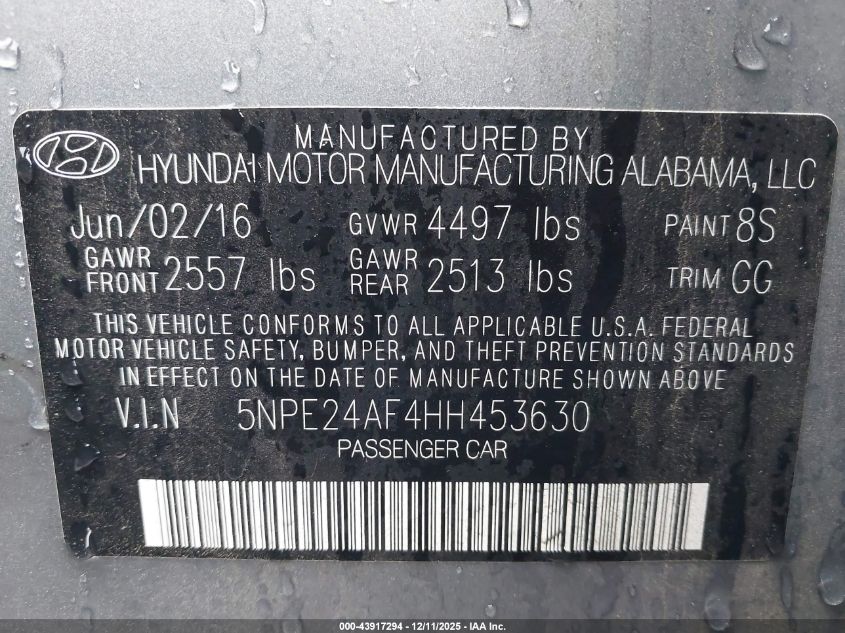 2017 HYUNDAI SONATA - 5NPE24AF4HH453630, цвет - Серый, 2.4, Бензин, Передний привод из США