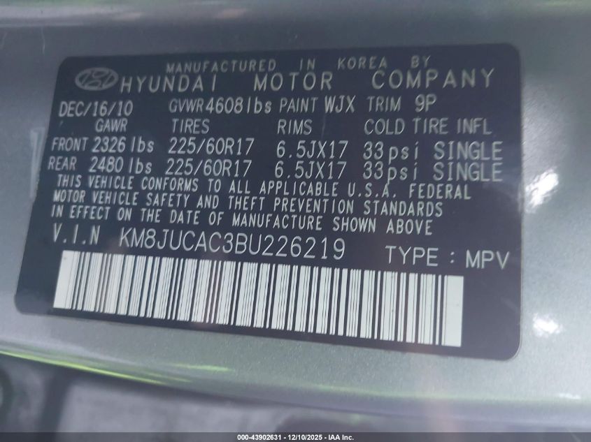 2011 HYUNDAI TUCSON - KM8JUCAC3BU226219, цвет - Серый, 2.4, Бензин, Полный привод из США