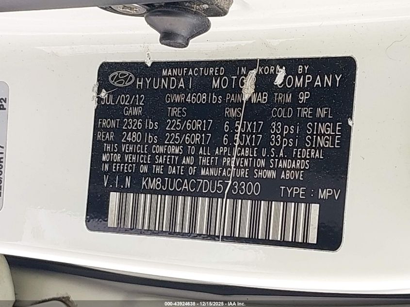 2013 HYUNDAI TUCSON - KM8JUCAC7DU573300, цвет - Белый, 2.4, Бензин, Полный привод из США